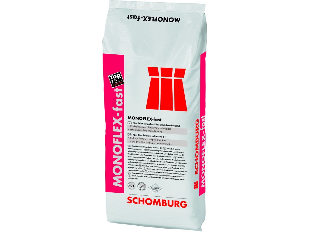 Schomburg MONOFLEX FAST je zlepšené rychletvrdnoucí flexibilní lepidlo třídy S1 pro lepení zejména obkladů a dlažeb. Můžete použít i na vytápěné podklady.