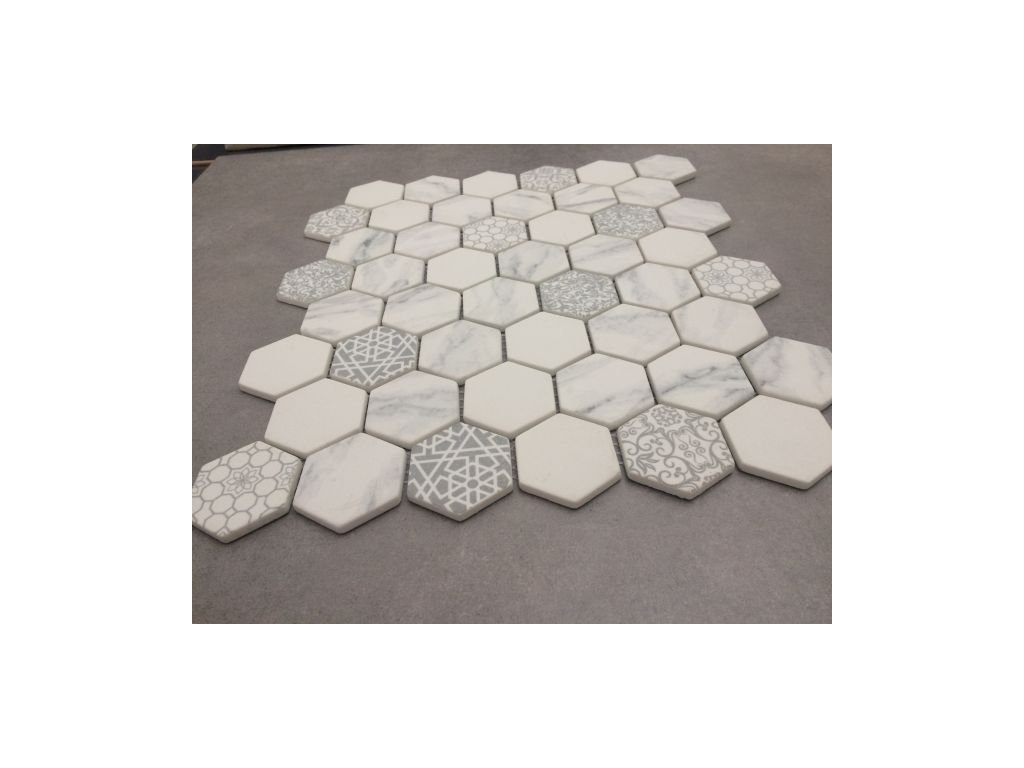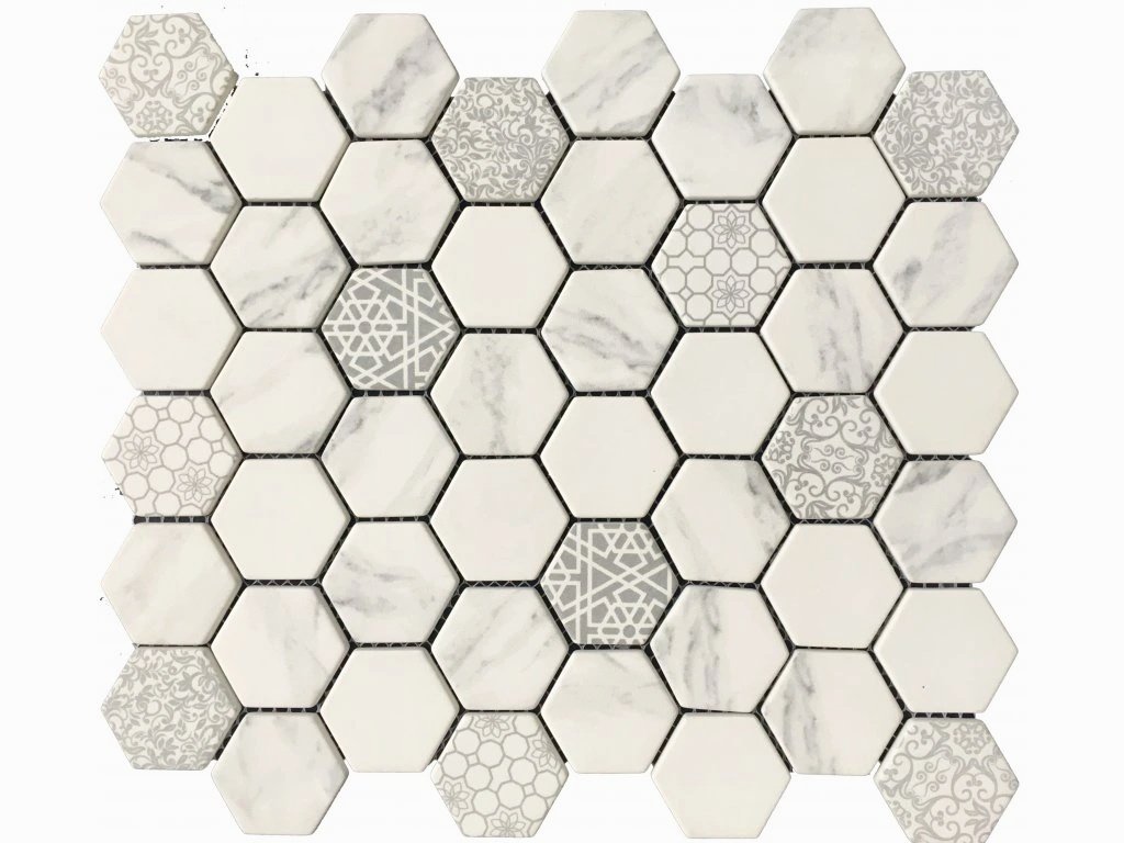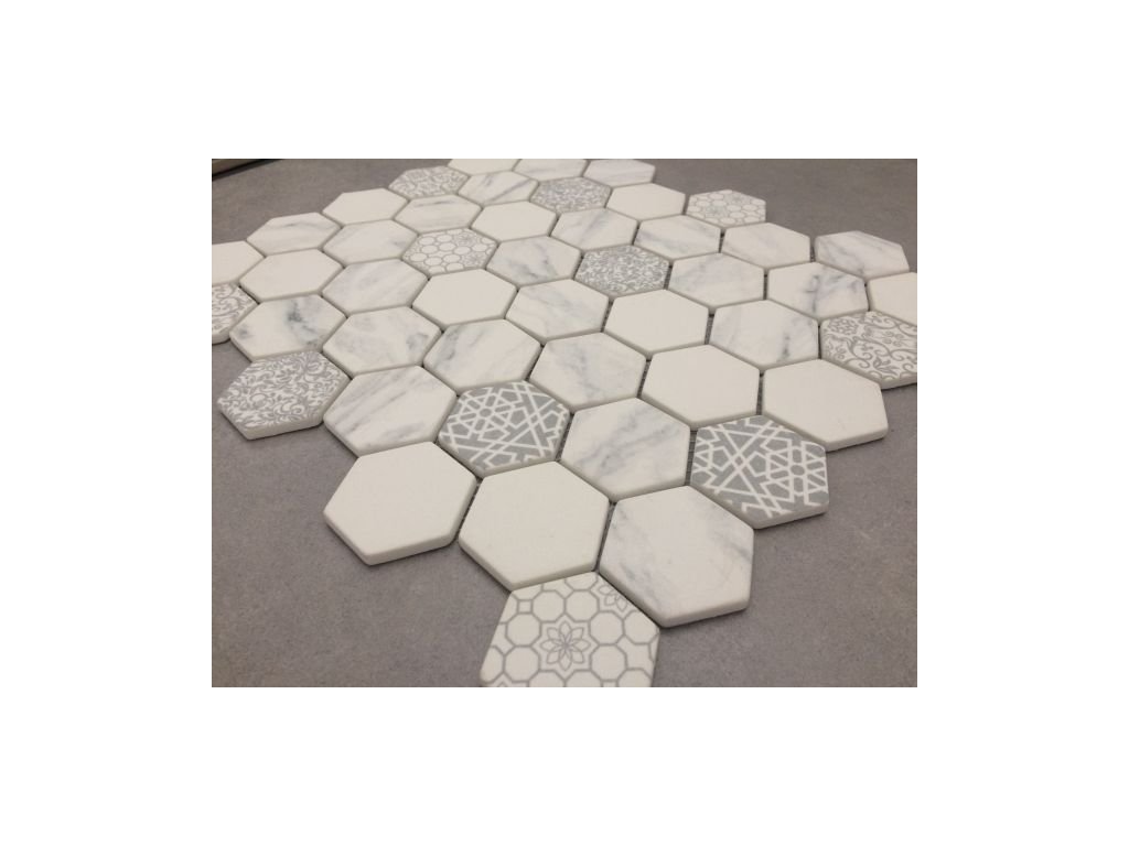 Mozaika matná z recyklovaného skla ve tvaru hexagonu, bílá, imitace mramoru a patchworku.