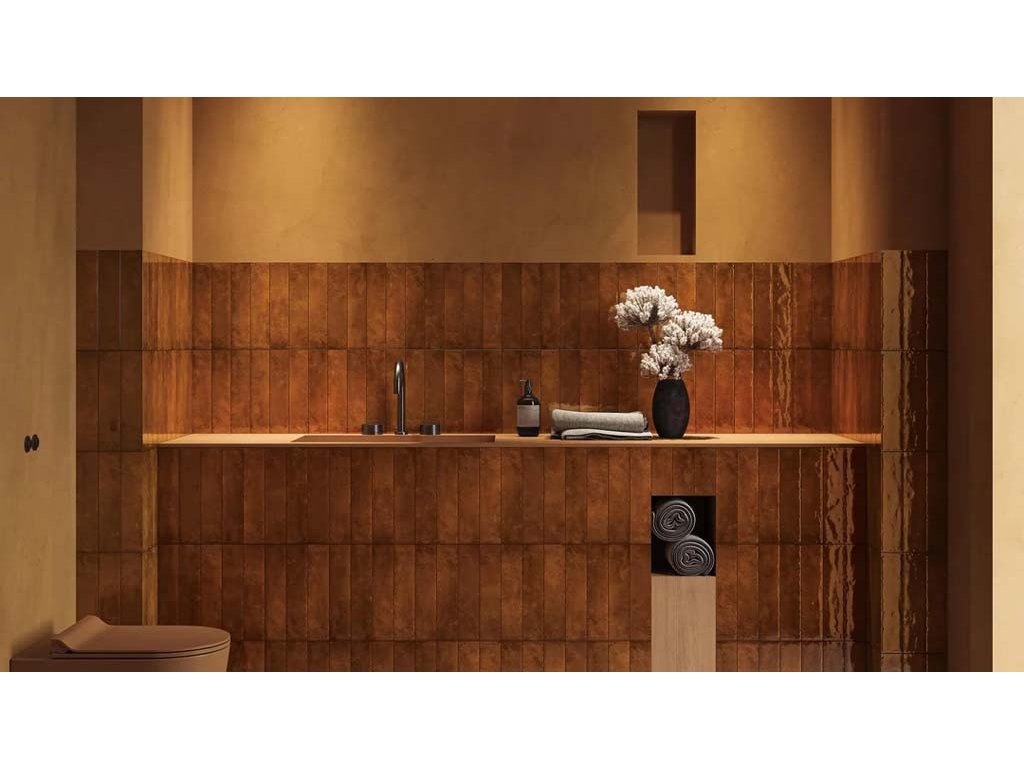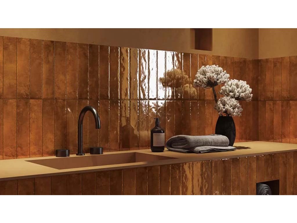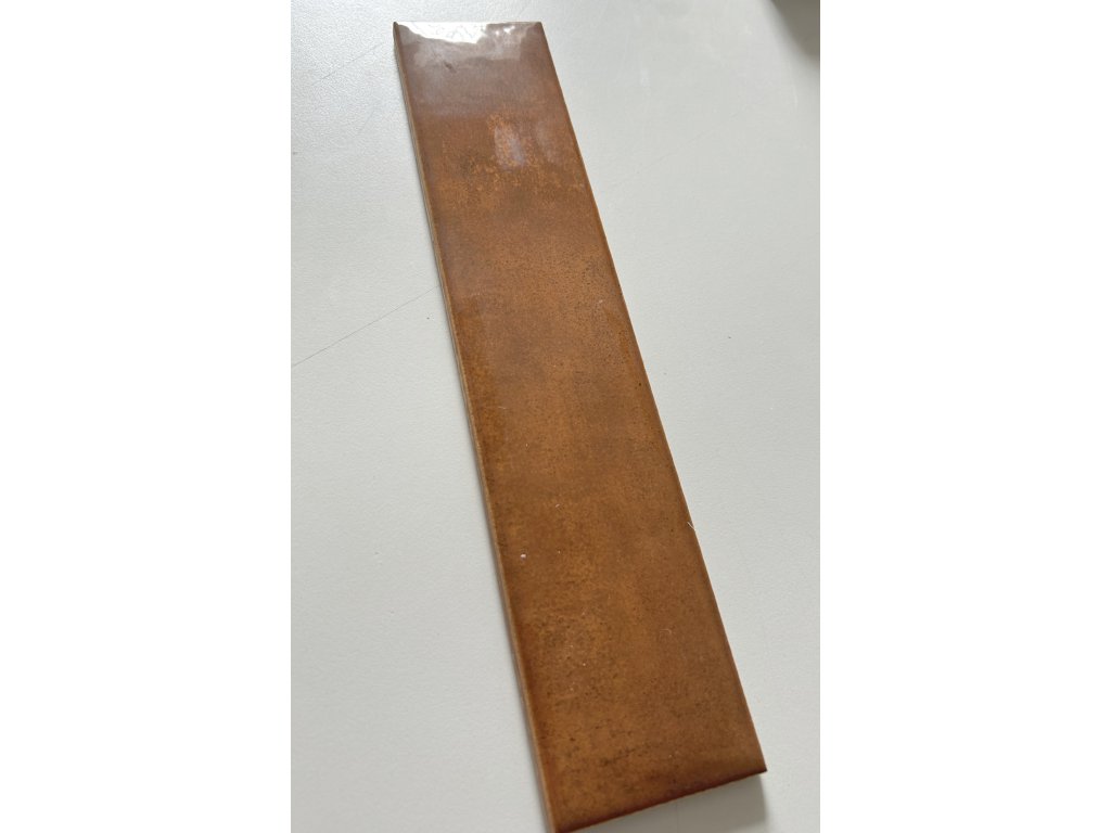 Keramický obklad hnědočervený, lesklý ve tvaru cihličky. Vhodný jako obklad do kuchyní i koupelen.