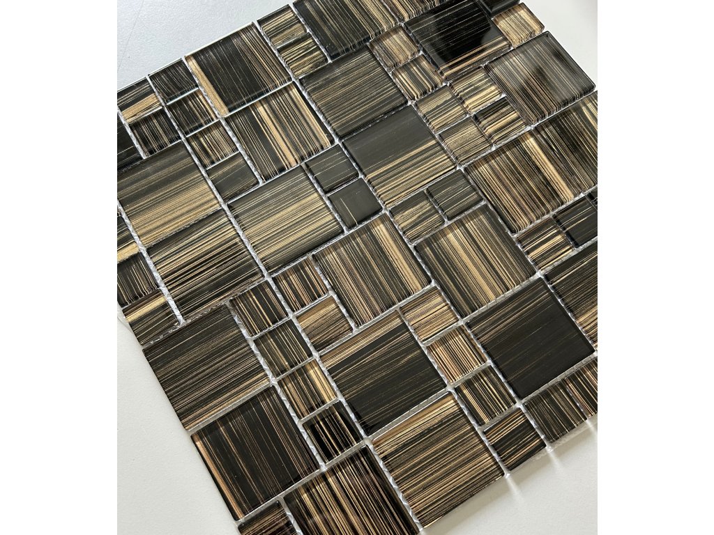 Skleněná mozaika šrafovaná zlato-černá. Velikost jednotlivých dílků 23x23 mm a 48x48 mm.