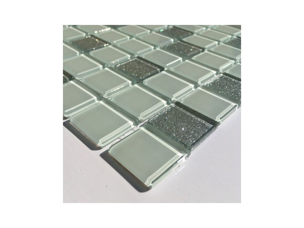 Skleněná mozaika bílo-šedá třpytivá. Lze ji kombinovat s dalšími materiály, například s obkladem nebo dlažbou, čímž vytvoříte jedinečný designový prvek.